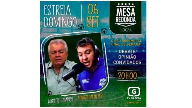 Estreia neste domingo (06), na TV Gazeta, que está transmitindo sua programação para Goiânia no Canal Digital 38.1, o programa esportivo “Mesa Redonda Local”, que será veiculado todos os domingos, de 20h às 21h, e terá a apresentação de Thiago Menezes e comentários de Adolfo Campos.