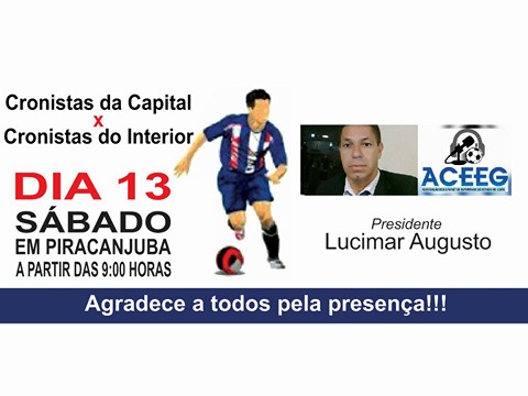 O presidente da Associação dos Cronistas Esportivos do Estado de Goiás, Lucimar Augusto, convida todos os associados junto à ACEEG para mais uma confraternização no interior do Estado de Goiás. No próximo sábado, dia 13h.