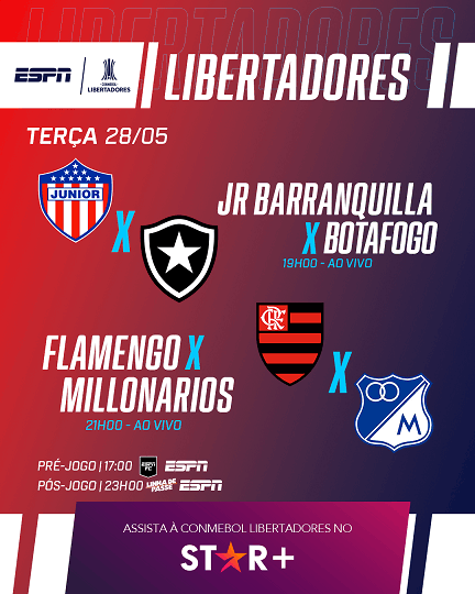 Confira onde assistir ao vivo às partidas de hoje, 28, da Libertadores e Copa Sul-Americana. LIBERTADORES 19h00 - Atlético/MG x Caracas - Paramount+ 19h00 - Junior Barranquilla x Botafogo - Espn4.